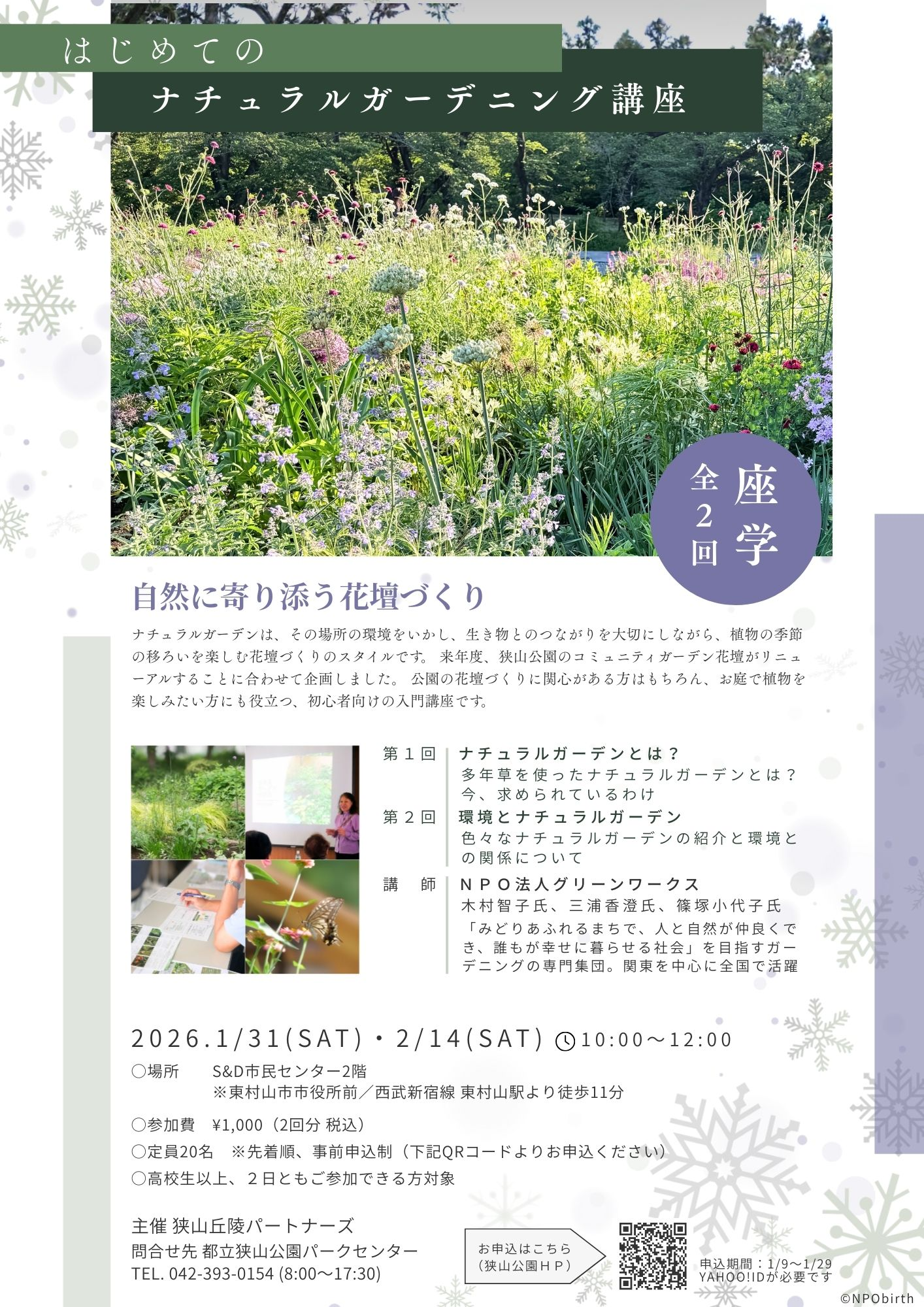 ナチュラルガーデンは、その場所の環境をいかし、生き物とのつながりを大切にしながら、植物の季節の移ろいを楽しむ花壇づくりのスタイルです。 来年度、狭山公園のコミュニティガーデン花壇がリニューアルすることに合わせて企画しました。 公園の花壇づくりに関心がある方はもちろん、お庭で植物を楽しみたい方にも役立つ、初心者向けの入門講座です。