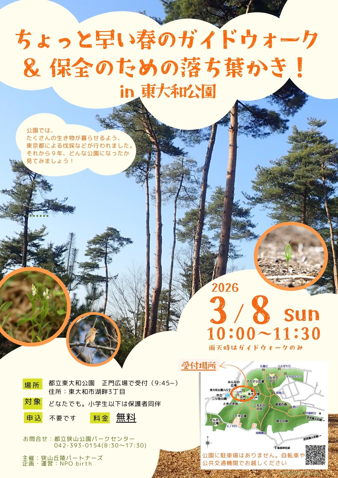更新伐採した雑木林や、明るく手入れしたアカマツ林など、東大和公園ならではのスポットをパークレンジャーがご案内します。早春に咲く植物の保全のための、落ち葉かきもちょこっとやります!お子様連れでも楽しめます。